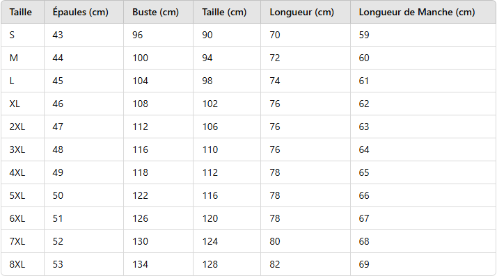 - Longueur des manches : Complète